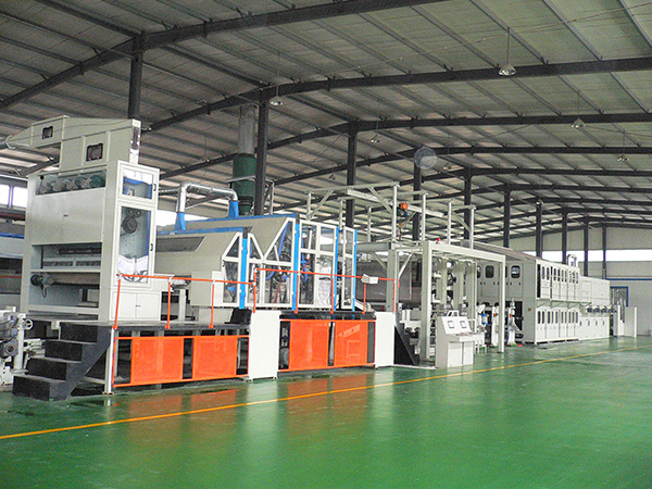 開(kāi)包→開(kāi)松→混棉一喂棉→梳理→鋪網(wǎng)一牽伸水刺→軋水→上漿→印花→烘干→卷繞→分切